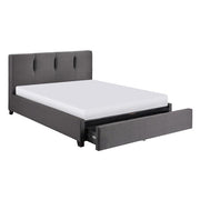 The streamlined design of the Aitana Collection provides a functional focal point for your bedroom. With styling that lends to placement in modern environments, the upholstered bed’s profile is defined by its low-profile and graphite-hued linen-like fabric for neutral accent to your bedroom’s modern decor. The California King platform bed’s low-profile footboard conveniently pulls out to reveal a storage drawer, providing functional space to store your essentials. 83.5 x 95 x 44.5H