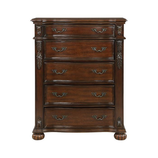 Rich in the aesthetic of Old-World tradition, the design of the Adelina Collection is the culmination of classic accenting that creates an elegant presentation for your bedroom. The serpentine front of the dresser features framed drawers, fixed-pull traditional hardware, acanthus leaf carvings, as well as bun feet. Furthering the timeless aesthetic that permeates the collection, is the cherry finish over birch veneer and pine solids. 65.5 x 19.5 x 40H