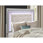 Adding a bold touch of glamour to your boudoir is the Alonza Collection. Finished in a metallic white, the embossed alligator board is reflected in the inlay mirrors of the California King bed. Back-lit LED headboard and mirror illuminate with a delicate touch, creating a dazzling glow. Turned feet provide a distinct departure from the linear design, adding a distinctly feminine flair. Drawer pulls add to the allure of the collection with an inlay crystal and chrome look. 80 x 90.5 x 62H