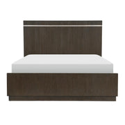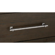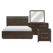 The Bellamy Collection’s intersection of modern lines and transitional appointments makes for a versatile pairing to your bedroom’s décor. The flat panel headboard features an inset mottled silver finished metal accent, it’s finish carrying over to the elongated bar hardware that front the case piece’s drawers. Ash veneer is finished in a dark brown for maximum decorative impact, serving as the perfect canvas to let your decorative flourish reign.