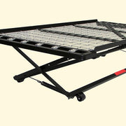 Framos Black 39" Pop Up Trundle, 70" X 38 1/2"W X 16"H, 53lbs. Made with high carbon rail steel, this bed frame comes with heavy duty east lift springs. Additional features are safety locks in raised and closed position. Features: Heavy Duty Easy Lift Spring Safety Locks in Raised & Closed Position Cross-Braces Provide Extra Support Made w/ High Carbon Rail Steel US-Made (Incl. Foreign Materials)