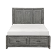 The Garretson Collection blends transitional lines with rustic styling to create an elegant addition for your bedroom. The distinct grain of the okume veneer features a gray finish. The queen bed features metal bar hardware on the picture frame drawer fronts of the low-profile storage footboard, the two drawers creating additional space within your room for soft good storage.