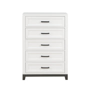 The Garretson Collection blends transitional lines with rustic styling to create an elegant addition for your bedroom. The distinct grain of the okume veneer features a gray finish. Metal bar hardware accents the picture frame drawer fronts of the chest.