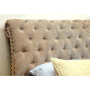 Boldly fashioned with a completely upholstered exterior, this sleigh bed provides a comforting twist to traditional designs. The gorgeous curvatures are emphasized by nailhead trim detailing along the sides and entrancing button tufting along the inner areas. The corduroy fabric is beautifully styled with a Mocha color to add both warmth and lightheartedness to any bedroom.