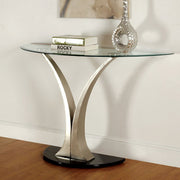 These contemporary living room tables feature oval tempered glass tabletops and distinct pedestals, sure to add a modern air to any living space.