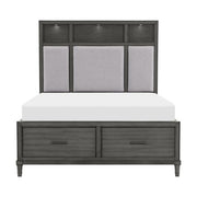 Modern convenience is paired with transitional style to create the versatile look of the Wittenberry Collection. The multi-functional design of the Eastern King bed allows for convenient storage within the footboard drawers, charging capability by way of the mounted USB ports, as well as display and illumination within the touch-engaged LED-lit open fronted bookshelves of the headboard. The bed’s headboard also features pebble gray hued fabric inserts creating complementing contrast to the collections gray finish over okume veneer. Dark bronze finished knob and bar hardware front the drawers of the footboard. 79 x 89 x 66H