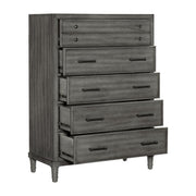 Modern convenience is paired with transitional style to create the versatile look of the Wittenberry Collection. The chest’s gray finish over okume veneer is complemented by the dark bronze finished knob and bar hardware that fronts the framed drawers of the piece. 38 x 19 x 52.5H