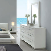 Christie Glossy White Dresser, 57 1/4"W X 17 3/4"D X 31 7/8"H, 183.7lbs. Take your bedroom to the next level with this modern dresser. The high gloss white finish brightens any setting. Features: Contemporary Style Felt-lined Top Drawers Solid Wood, Others High Gloss Lacquer Coating White