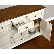 SABRINA Off White/Cherry Server, Cherry & White, 56 1/2"L X 19"W X 36"H, 189.2lbs. The cottage style combined with the beautiful two-toned finish on this server adds a cozy look to any dining space. Available in 2 finishes. Features: Country Style Storage Base Design Matching Server Solid Wood, Wood Veneer, Others Available in 2 Finishes Cherry & White
