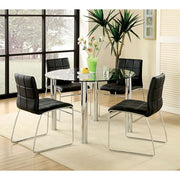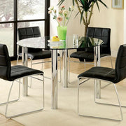 Kona I Chrome Round Dining Table, 45"DIA X 30"H, 87.3lbs. Tempered glass top rests on four solid chrome posts, creating a sleek looking framework for a contemporary dining set. Black or white padded side chairs with thinner chrome legs provide contrast to the bold table legs and create visual interest. Features: Contemporary Style Bold Chrome Legs 12mm Tempered Glass Top