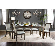 Entertain your guests with this eye-catching and sophisticated transitional dining table and padded leatherette chairs. The chairs are upholstered in silver, while the wooden frames are finished in gray. With itching borders on both chairs and table, the result is a fine dining set you can see in your home!