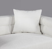 Let this chic and comfy set bring excitement and personality to your living room. Not only is the silhouette fun, inviting, and unique, but the fabric itself is a statement of its own. Bright white boucle fabric wraps around the piece, filling every deep horizontal tuft. Tall tuxedo-like arms and backrest cradle the lengthy bench-style seat cushion between. Gold-plated steel legs is the proverbial cherry on top of this decidedly alluring piece.