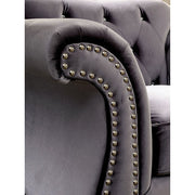 With the luxurious presence of this glam set in your home, you'll feel and relax like the queen of the castle. Featuring a curved back design with beautifully tufted detailing and curved arms adorned by perfectly placed nail head trim, this piece is a must-have for the sophisticated household.