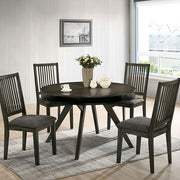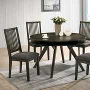 Create the perfect backdrop for hosting family celebrations and memorable dinner parties with this uniquely-styled dining set. The table boasts an extra storage shelf built into the apron set atop a mid-century base. Coordinating chairs boast linen-like fabric, narrow spindle backs, and tapered legs. The table is available in both cozy round and expansive rectangle designs.