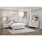 Modern Classicism is defined in the elegant presentation of the Theodora Collection. The treasured themes of old-world accenting – egg and dart molding, acanthus detailing, rope molding – front the queen bed, the timeless style enhanced by the modern pearl white finish over the collection’s ash veneer. The mansion headboard features pearl white textured fabric upholstery with button-tufting and nailhead trim.