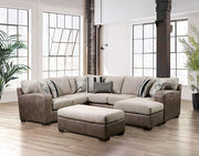 ASHENWEALD Sectional, 123"L X 97"W X 38"H (SEAT HT: 19 1/2", SEAT DP: 24"), 300lbs. Relax in style on this large U-shaped sectional. The interplay between the two shades of brown creates a catchy two-tone color scheme that will surely pop in your living room. The mixed materials are a unique feature as well--the backs and seats are of soft line-like fabric, while the frame and arms are upholstered in microfiber. A movable bottom ottoman allows for the position of the chaise to be configured as you please, either to the left or the right of the piece.