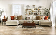 A pronounced honeycomb pattern offers subtle visual texture from a few feet away for an attractively ambiguous appearance. Book-ended by left and right-side corresponding chaise lounges, each with a single subtly curved track arm, the sofa between features giant square pillow back-rests and super stuffed seat cushions. A variety of pillows offer a colorful sense of whimsy while tapered wood feet provide a solid sense of security.