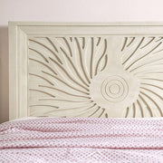 This collection is a definite showstopper. An etched wooden sunburst pattern serves as the focus, grabbing everyone's attention to the tall and imposing headboard. The same elaborate design is found on the night stand and dresser panels with cleverly hidden finger pulls. What keeps the flamboyant centerpiece in check is the rather subdued ivory color, hand-painted and hand-finished to bring out the beauty of the solid Brazilian pine wood. The result is a bedroom set that's nothing short of exotic.