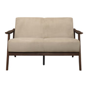 The frame of the Carlson Collection recalls a time when simplicity of profile was the height of style. The streamlined design of the love seat's subtly sloped wood arms and legs is finished in dark walnut which serves to highlight the blue-gray velvet covering.