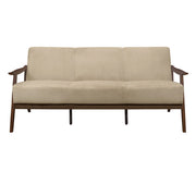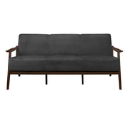 The frame of the Carlson Collection recalls a time when simplicity of profile was the height of style. The streamlined design of the sofa's subtly sloped wood arms and legs is finished in dark walnut which serves to highlight the blue-gray velvet covering.