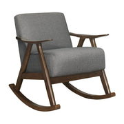 The frame of the Waithe Collection recalls a time when simplicity of profile was the height of style. The streamlined design of the rocking chair features subtly sloped wood arms, legs and rails that are finished in dark walnut, serving to highlight the brown seat covering.