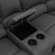 Surround yourself in comfort and style with the reclining sectional. Soft nubuck fabric is paired with dense foam cushions to create plush pockets of comfort from every angle. Oversized head and arm rests billow as the latch activated recliners smoothly slide up to create a relaxing pose with supported leg rests. Never leave your seat with a storage compartment for quick stowing. Update your home to expansive living room seating with integrated functionality that keeps your home looking refined.