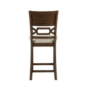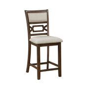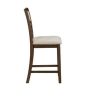 Create a cozy and inviting dining space with this stylish 5-piece counter height dining set. Crafted from Mindy wood veneer, solid wood, and engineered wood with a rich dark brown finish, this set includes a counter height table and four matching chairs. The table features a convenient open shelf for storage or display, while the chairs offer comfortable seating with beige textured fabric upholstered cushions. Perfect for casual meals or entertaining, this set comfortably seats four and adds a touch of warmth and elegance to any kitchen or dining area.