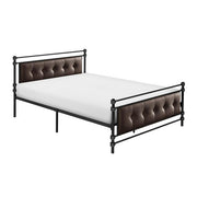 Modern traditional styling is utilized to create the design of the Jayla Collection. Black metal framing is perfectly contrasted by the brown faux leather button-tufted inserts of the full size headboard and footboard, creating a unique look for your bedroom. The collection is also offered in twin. 56 x 77.75 x 35.5H