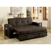 MAVIS Futon Sofa, 75"L X 37"W X 36"H, 171.1lbs. A staple for any mancave or entertainment room, this convertible futon sofa is a handy addition that is well worth the floor space! The sofa frame effortlessly unfolds to become a large bed, but can be transformed into a double-chaise with its pull-out trundle. Built-in cup holders can be found on each arm while side pockets keep reading materials within easy reach. The entire exterior is upholstered in a soft brown fabric that will pair well with any transitional home.