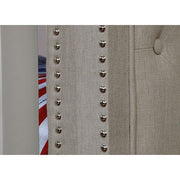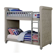 Here's a twin over twin bunk bed that's not only comfortable, but also stylish! The light gray linen-like fabric can be found along the entire frame while rolled ends and nail heads create a sense of grace and charm. The kids will love playing royalty in this padded button-tufted piece!