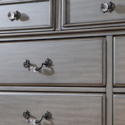 The paneled headboard and footboard of the bed and mirror incorporates beautiful floral accents that match well with the elegant antique brass handles found on the matching case goods.