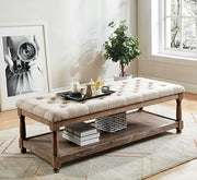 Tanya Beige Bench, 48"L X 15 3/4"W 18 1/2"H, 66.22lbs. The perfect bench for a living room or an entryway where you want to make a quick stop. The worn wood look adds that touch of country charm, like a nice place to kick o Features: Button Tufted Seat Open Bottom Shelf