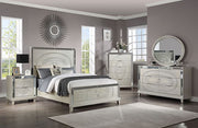 Gracing the panels of this bedroom set is an intricate play of radial and circular lines, engraved in polyresin material. Your eyes are drawn towards this beautiful pattern reminiscent of the art deco era. Mirror panels line each front edge, adding to the luxurious appeal. On top of that, the classy champagne finish exudes subtle warmth that makes this set, even in its grandeur, still plenty welcoming.